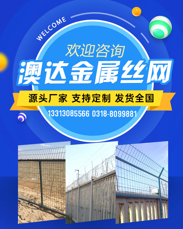 安平县澳达金属丝网制品有限公司我公司的主要产品有:铁路护栏网、(2012)8001防护栅栏、(2012)8002防护栅栏、铁路刺丝滚笼、铁路栅栏加密、加高网片、焊接网隔离栅、荷兰网隔离栅、GRC复合立柱、刺丝隔离栅、高速公路防眩网、桥梁防抛网、波形护栏板、道路护栏、市政护栏、绿化带隔离网、临时、可移动护栏、篮球场围栏网、网球场围栏网、足球场围栏网、机场围界隔离网、监狱隔离防护网、车间/厂区隔离网、南水北调隔离网栏、框架护栏网、双边丝护栏网、三角折弯护栏网、桃型柱护栏网、C型柱带勾护栏网、Y型柱护栏网等。